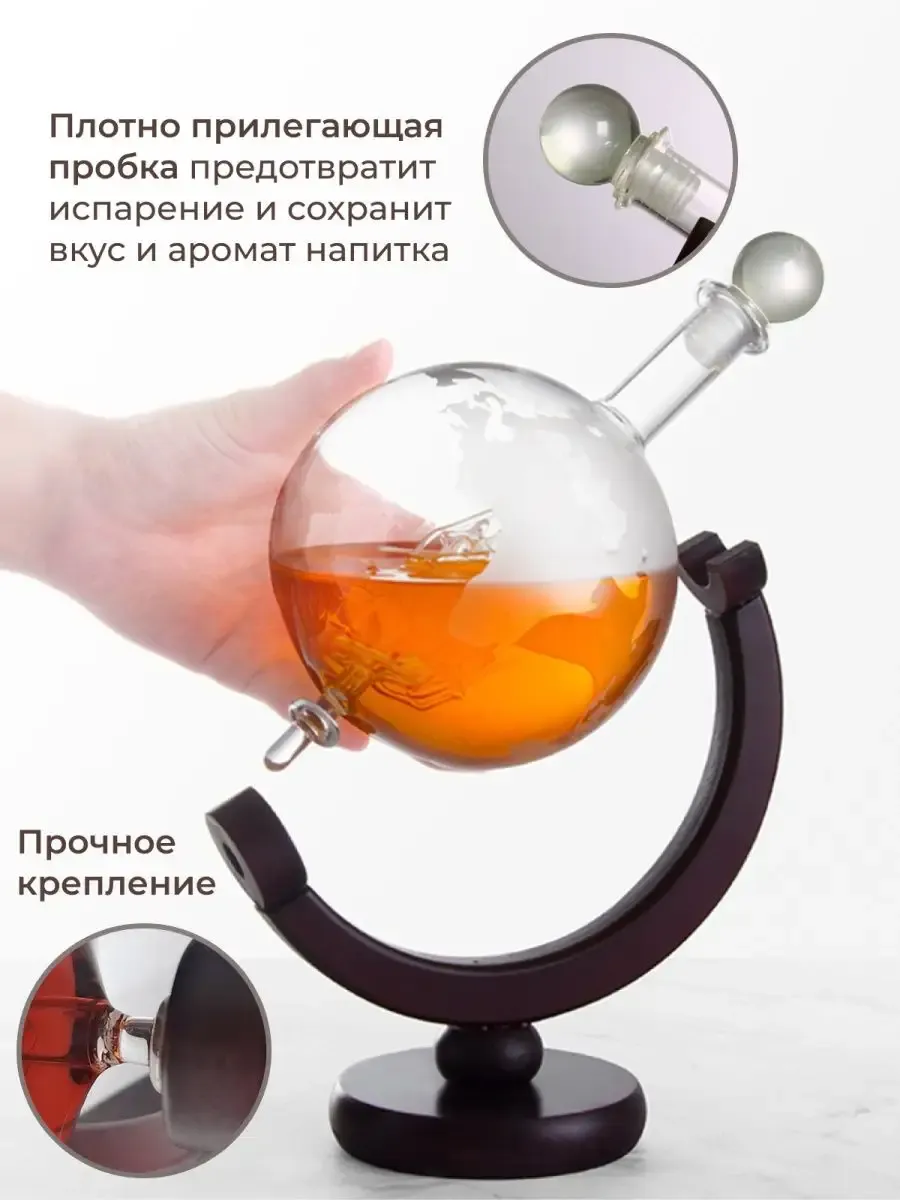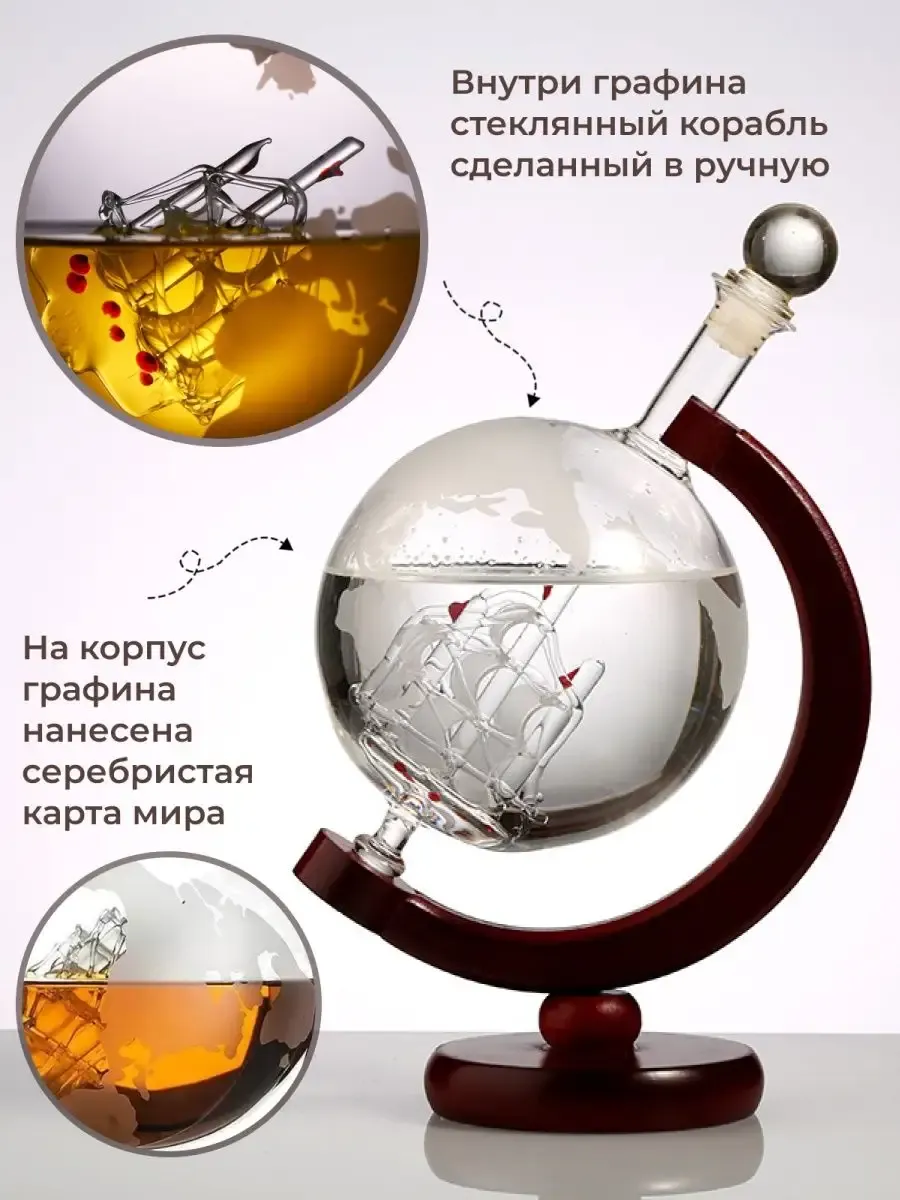 Графин глобус с кораблем для виски декантер подарочный изготовлен из дерева и стекла, что придает ему особую элегантность и привлекательность. Деревянная подставка, на которой расположен глобус, дополняет его стильный и мужской облик.