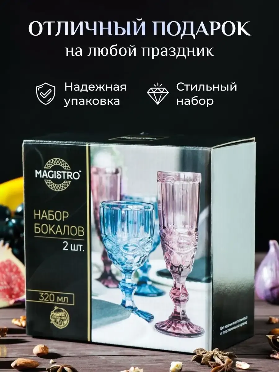 В наборе Бокалы 2 шт, выполнены из высококачественного стекла объёмом 320 мл. Бокалы праздничные в форме кубков! Набор изысканных бокалов изготовлены из высококачественного закаленного стекла устойчивого к царапинам. Набор винтажных бокалов подходят для подачи любых напитков: воды, вина, сока, компота, пива, вина, мартини, шампанское. Универсальный набор бокалов подойдет для сервировки стола. Они украсят ваш праздничный стол. Поднимут настроение за ужином и придадут торжественность особому моменту. Бокал из цветного стекла выглядит дорого и солидно, ни чем не уступает посуде из хрусталя. В цветных бокалах все напитки смотрятся необычно и эффектно. Благодаря уникальному преломлению света любой напиток, будь это вино или шампанское красиво играет. Выглядит потрясающе. Цветные фужеры со временем не выгорают и не выцветают, что способствует длительному пользованию. Благодаря специальной технологии изготовления красящийся пигмент не вымывается. Поэтому цветные бокалы будут всегда иметь насыщенный цвет стекла, который не смывается. Такие бокалы поддерживают температуру напитку, и вино или шампанское на дольше остаются холодным. Подходят как для ежедневного так и праздничного использования. Если вы любите красивую и посуду изысканного дизайна, то этот набор для вас! Наш набор стильных бокалов станет изюминкой вашего праздничного стола. Бокалы на устойчивой ножке не теряют вид при ежедневном использовании. Качественное стекло и уникальная форма делают бокал невероятно особенным. Стильный минималистичный дизайн украсит и дополнит любой интерьер. Классический дизайн придется вам по вкусу.