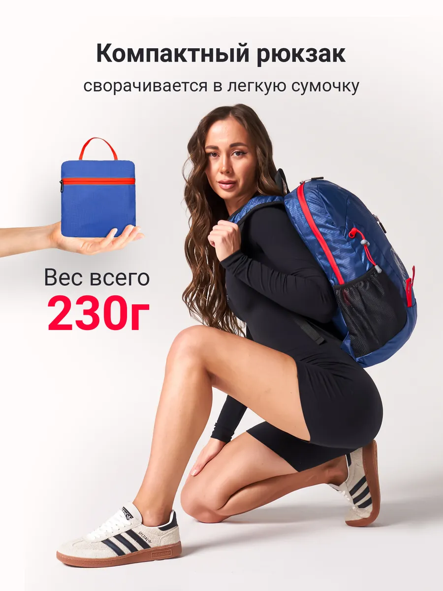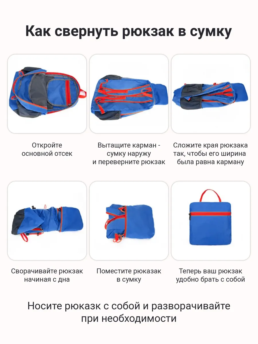 Рюкзак компактный складывается в маленькую сумочку которую можно всегда взять с собой и при необходимости разложить в рюкзак и взять все необходимые вещи. при этом сделан рюкзак из качественного спортивного материалы который не промокает. Объем рюкзака 15-20 литров .